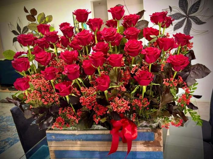 Capture their heart with this tall, elegant display of premium red roses, beautifully arranged in a rustic box and complemented by lush foliage and delicate filler flowers. This striking arrangement symbolises love, admiration, and beauty in its purest form. The perfect gift to convey deep emotions and lasting affection for someone truly special.